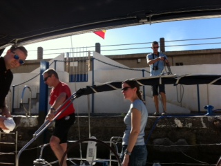 1.1. Ausschlafen! Spätes gutes Frühstück als gute Grundlage für unsere längste Überfahrt nach Gran Canaria. Unser Ziel ist Puerto de Mogán. Wir treffen einen Wal, der uns zulukt. Gegen Abend kommt Wind auf, der uns voran bläst durch die Nacht. Immer zwei der Crew haben Wache und wir segeln am Wind in ziemlicher Schräglage. Die starke Brise ist nicht für alle bekömmlich. Aber ein Teil der Crew bleibt fit, so dass wir auch dem stärker werdenden Wind trotzen und mit gerefften Segeln am Morgen des 2.1. schließlich in Puerto de Mogan anlegen. Das Jahr beginnt mit einer Grenzerfahrung. Das wichtigste: Die Stimmung an Bord ist gut. Jeder trägt Verantwortung dafür.